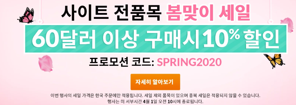 60 달러 이상 구매시 10% 할인이 가능하며 프로모션코드 [SPRING2020]을 결제시 입력하면 10% 할인을 적용받을 수 있습니다. 해당 행사는 한국 주문에만 적용이 되고 미 서부시간 4월 1일에 종료됩니다. 세일 제외 품목이 있고, 중복 세일은 적용되지 않을 수 있으니 주문시 참고하시고 빨리 주문을 해야 혜택을 받아볼 수 있겠네요.
