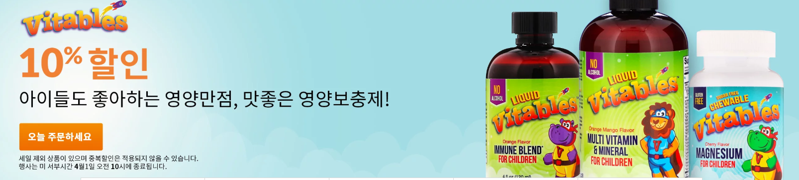 VITABLES의 영양보충제를 구매하는 경우 10% 할인된 가격으로 구매 가능하며 행사는 미 서부시간 4월 1일 오전 10시에 종료됩니다.