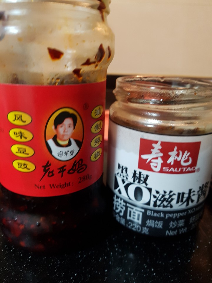 엑소소스와 라조장(라오깐마)입니다. 중국풍 볶음밥을 만들고 싶을때 사용하는 소스입니다. 엑소소스는 굴소스보다 훨씬 향이 강하고 짠맛이 강하기 때문에 아주 조금만 넣어주는 것이 좋습니다.