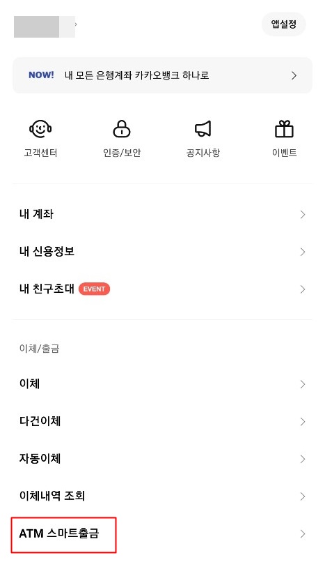 메뉴 하단쪽에 있는 이체/출금란이 있어요. 가장 밑에 빨간색으로 표시된 ATM 스마트출금을 선택해 주세요.