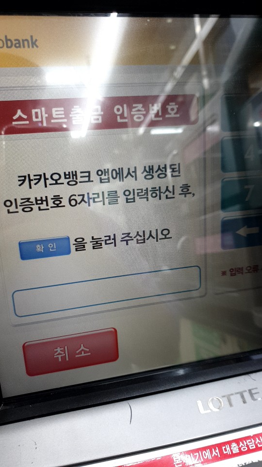 스마트출금 인증번호를 입력해줍니다. 카카오뱅크 앱에서 발급받은 스마트출금에 필요한 인증번호를 입력해 주세요.
