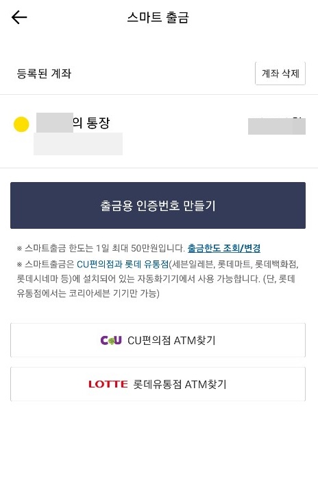 그 밑에 출금용 인증번호 만들기, CU 편의점 ATM 찾기, 롯데 유통점 ATM 찾기 등의 버튼을 확인할 수 있어요.