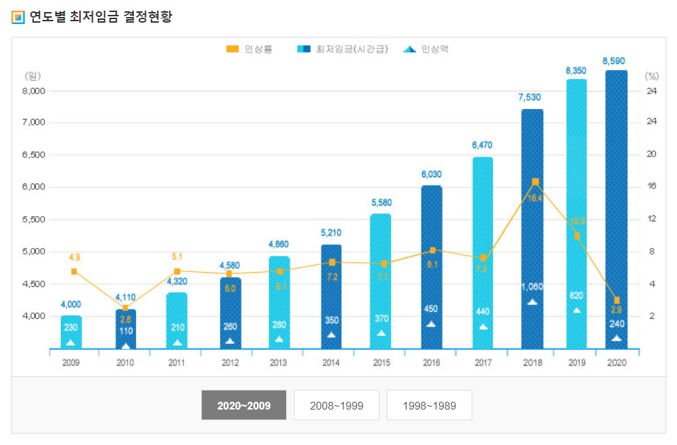 10년 전의 최저임금과 비교하면 현재 약 2배가량 꾸준히 최저임금이 인상되고 있었던 것을 확인할 수 있습니다.