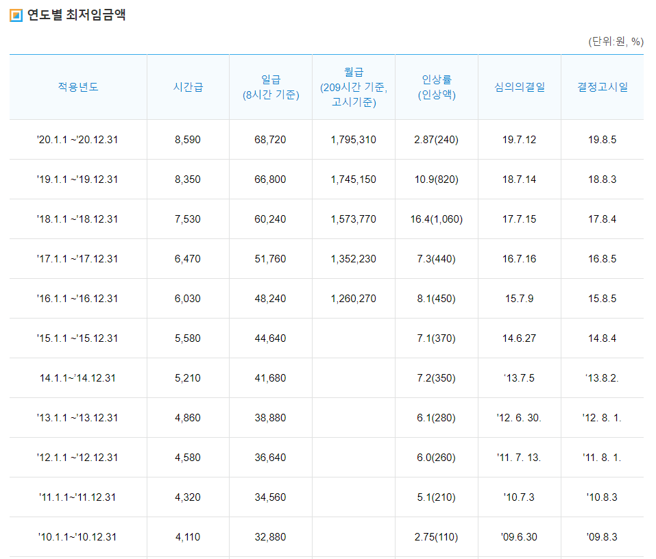 위의 표는 최저임금위원회에서 확인할 수 있는 연도별 최저임금액입니다.