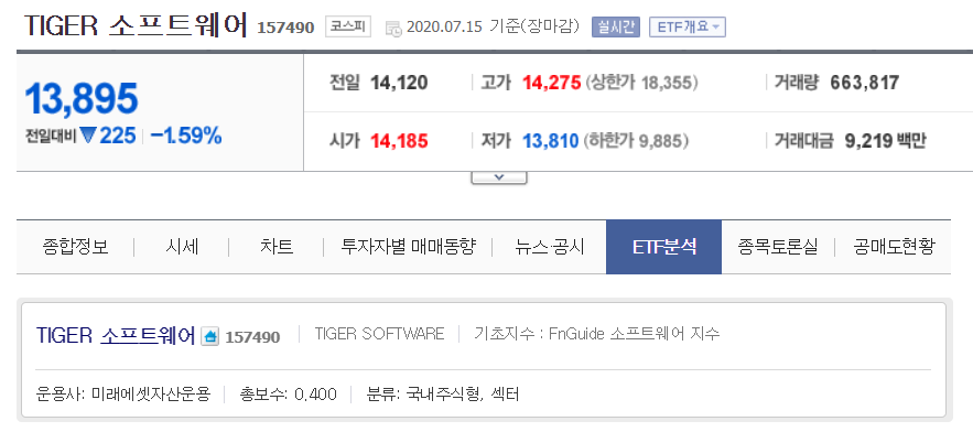 미래에센자산운용사에서 운영하는 ETF이고 현재(7/15) 1주당 13,895 원입니다.