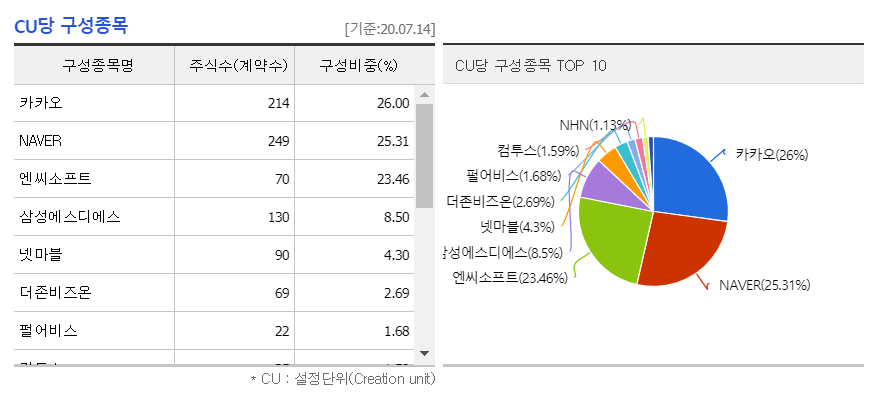 카카오, 네이버, 엔씨소프트, 삼성에스디에스, 넷마블, 더존비즈온, 펄어비스 등등 구성종목명과 구성비중을 확인할 수 있습니다.