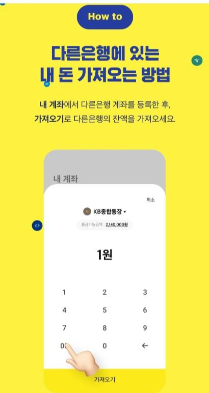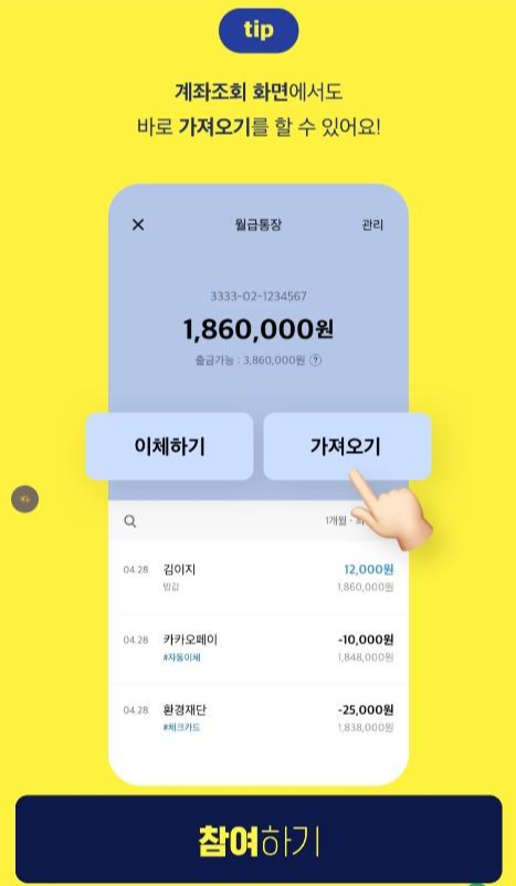 이렇게 등록을 한 후 내가 사용하는 계좌로 들어가면 이체하기 외에 가져오기라는 버튼이 생긴 것을 볼 수 있습니다.