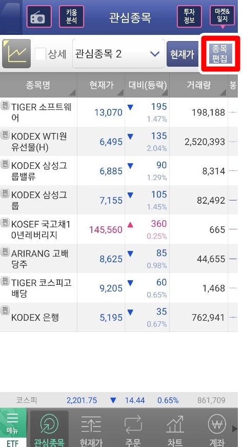 관심종목 화면에서 오른쪽 상단에 빨간표시를 해 둔 종목편집을 눌러줍니다. 종목편집에 들어가면 주식, ETF, ELS, ETN, 신주인수권 등 추가할 수 있는 종목들을 검색할 수 있습니다.