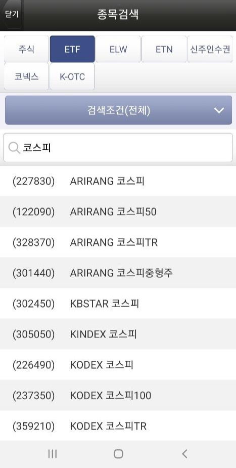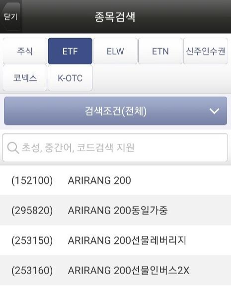 영웅문S 어플 종목검색 화면 상단에서 주식, ETF를 눌러보면 위와 같은 화면이 나옵니다. 첫번째 사진은 주식 종목검색, 두번째 사진은 ETF 종목검색 화면입니다. 종목검색 화면에서 일반주식 종목 이외에도 ELW,ETN,신주인수권 등을 조회할 수 있습니다.
