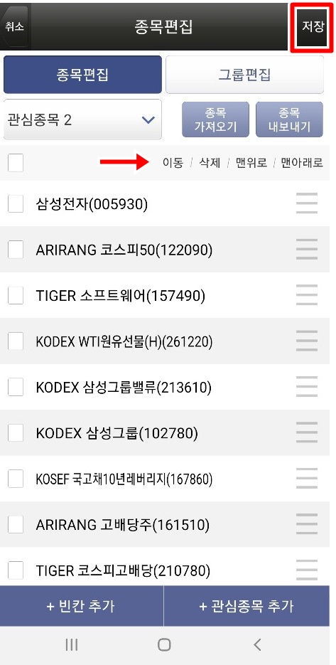종목 편집에서 원하는 종목들을 모두 추가했으면 왼쪽 상단의 저장버튼을 눌러줍니다. 하단에 빨간색 화살표 부분을 보면 이동/ 삭제/ 맨위로/ 맨아래로 등 나의 관심도나 중요도에 따라서 종목의 순서를 변경해 줄 수 있습니다.