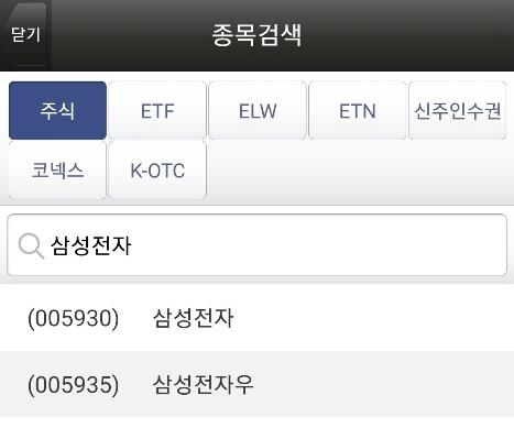 종목 이름을 검색하거나 초성, 코드명 등으로도 검색이 가능합니다.종목 이름 : 삼성전자