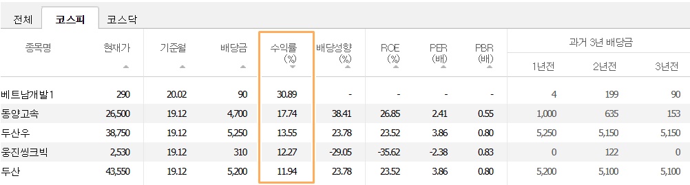 단순히 배당금만 참고하는 것보다는 수익률과 과거 배당 내역을 확인해보는 것이 좋습니다. 예를들어 수익률을 기준으로 정렬을 해보겠습니다.