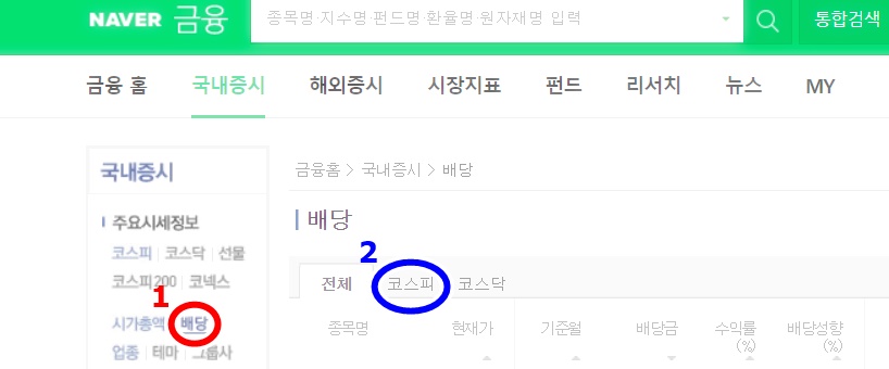 위와 같이 배당내역을 확인할 수 있는 탭으로 넘어갑니다(1번 빨간색 동그라미) 해당화면을 즐겨찾기 해두면 더 편리하게 사용할 수 있습니다. 처음 화면에서는 전체 종목이 검색이 되는데 코스피, 코스닥 시장 주식들을 분류해서 찾아볼 수 있습니다.