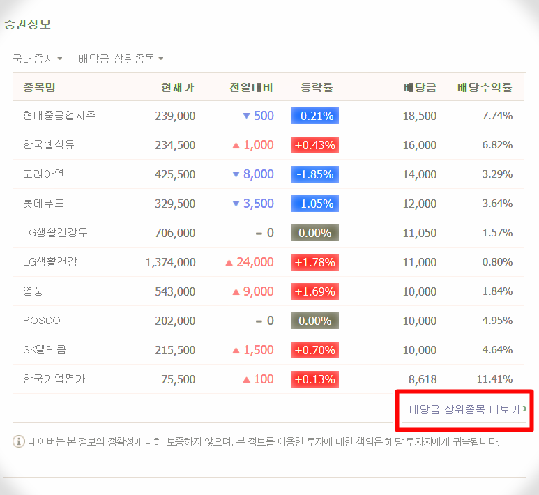 여기에서 하단 빨간박스 안의 배당금 상위종목 더보기를 눌러줍니다.
