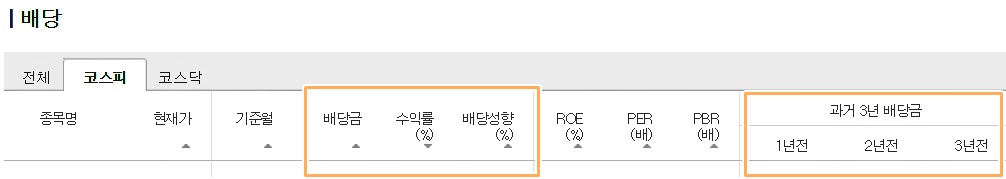 여기에서 제가 주로 참고하는 기준은 수익률과 배당금액, 배당성향 등과 과거 배당금 내역입니다. 각 카테고리 밑의 화살표를 눌러주면 오름차순, 내림차순 등으로 정리가 됩니다. 따로 엑셀 파일로 작업하지 않아도 바로 확인이 가능하니 정말 간단하고 편리한 방법인 것 같아요.