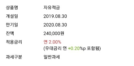 사실 해당 적금을 개설한 건 작년 시점이라서 적용금리가 연 2% 였습니다. 그런데 지금은..... 연 1.1%로 내렸네요. 2019년 8월에만 해도 적용금리가 연 2%였고 우대금리를 연 0.2% 까지 받을 수 있었습니다. (적금 기간을 늘리게 되면 이율도 조금씩 더 높아집니다.)