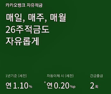 주거래 통장을 카카오 뱅크로 바꾸면서 그동안 많은 서비스를 사용해 봤습니다. 예금, 적금부터 세이프박스 등 다양한 상품들을 이용하고 있습니다. 많이 알려져 있는 카카오뱅크 26주적금, 자유적금도 이용해 보고 정기예금도 계속 들고있습니다. 1년 전 적금 풍차 돌리기를 실험해 보려고 가입했던 자유적금이 곧 만기라는 문자를 받아서 확인해보며 정보를 정리해 봤습니다.