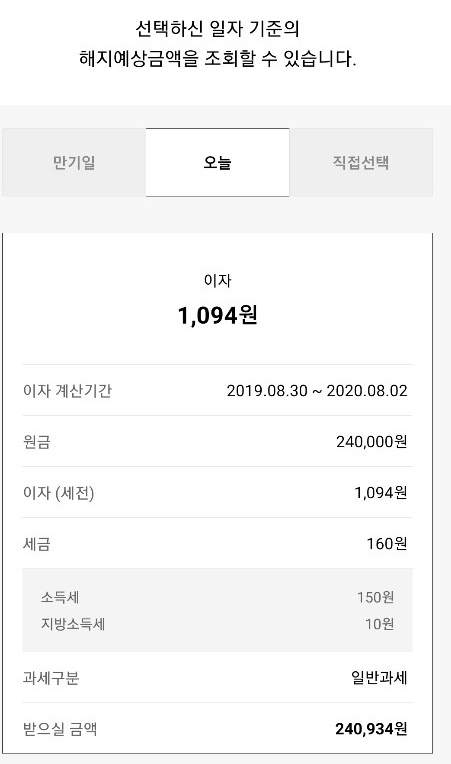 적금 이자를 확인할 때에는 예상 해지 시점을 선택한 후 세전, 세후의 이자와 세금까지 확인이 가능합니다. 적금 계좌를 선택하고 만기전에 해지하고 싶다면 오늘을 기준으로 확인, 만기후의 이자를 확인하고 싶다면 만기일을 선택하시면 됩니다.
