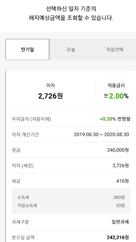 이렇게 소액으로 1년을 설정해 두었을 때 만기 이자가 얼마나 붙었을까요?