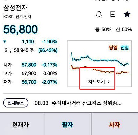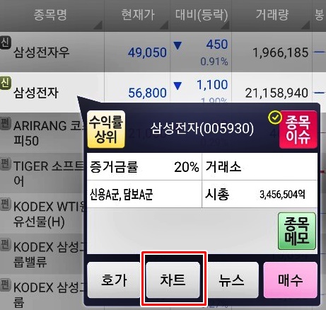 사용하는 증권사 프로그램에 따라서 차트를 누르면 해당종목의 차트를 확인할 수 있습니다. 차트에서 기간을 설정할 수 있는데 세부적으로 분,틱 단위까지도 확인이 가능합니다.