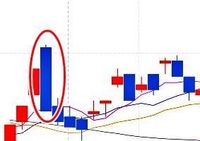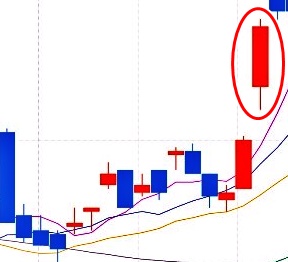 위 그래프에 빨간 동그라미 안에 있는 것처럼 빨간색으로 표시된 캔들을 양봉이라고 합니다. 양봉은 전날 종가(장이 종료할 때 가격)보다 주가가 올랐다는 것을 의미합니다.
