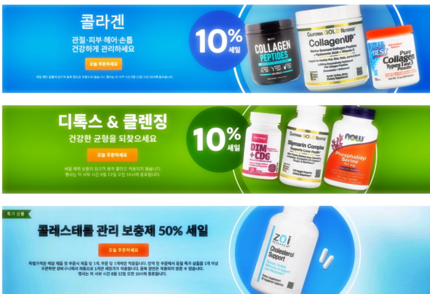 이번 달 할인행사 중 눈에 띄는 건 콜라겐, 디톡스 제품들, 콜레스테롤 관리 보충제가 있습니다. 특히 콜레스테롤 관련 제품들은 50% 세일가로 판매되는 특가 상품들이 있네요.