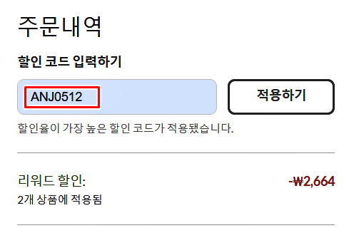 구매 시 할인코드 입력란에 위 할인코드 중 적용 가능한 코드를 입력하면 리워드 할인이 자동으로 적용됩니다. 결제 전 위 할인 코드를 입력하지 않으면 할인이 적용되지 않으니 꼭 제대로 할인이 적용되었는지 확인 후 결제 진행하셔야 해요~