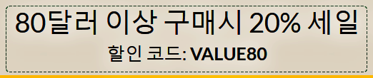 총 80 달러 이상 구매 시 20% 할인코드 VALUE80