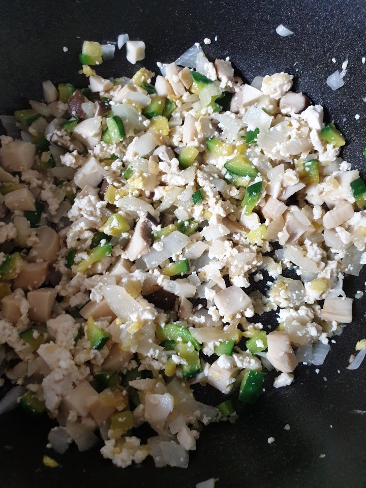 으깨 둔 두부를 넣고 모든 재료를 섞어주면서 계속 볶아주세요. 재료가 살짝 고슬고슬해지는 느낌이 날 때까지 볶아주었습니다.