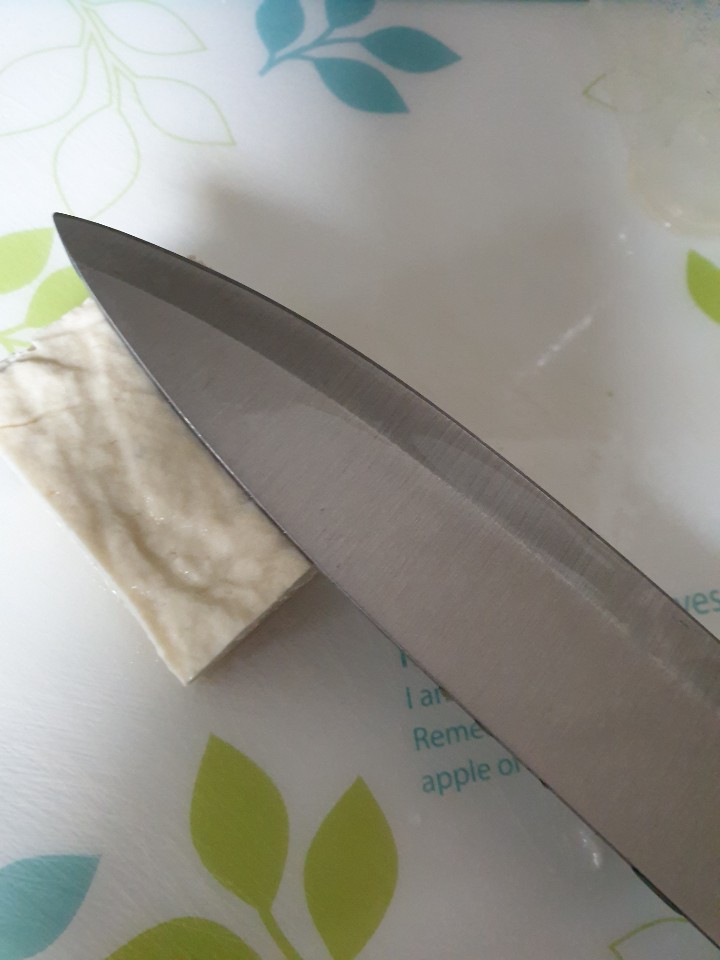 먼저 두부를 으깨어줍니다. 두부를 으깨는 방법은 칼 등에 살짝 힘을 주어 비스듬하게 눌러준다는 느낌으로 두부를 눌러주세요. 생각보다 쉽게 두부가 으깨집니다. 이 동작을 여러 번 반복하면 더 부드러운 두부가 됩니다.