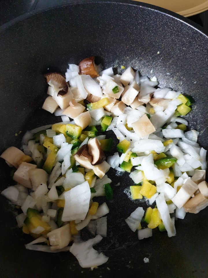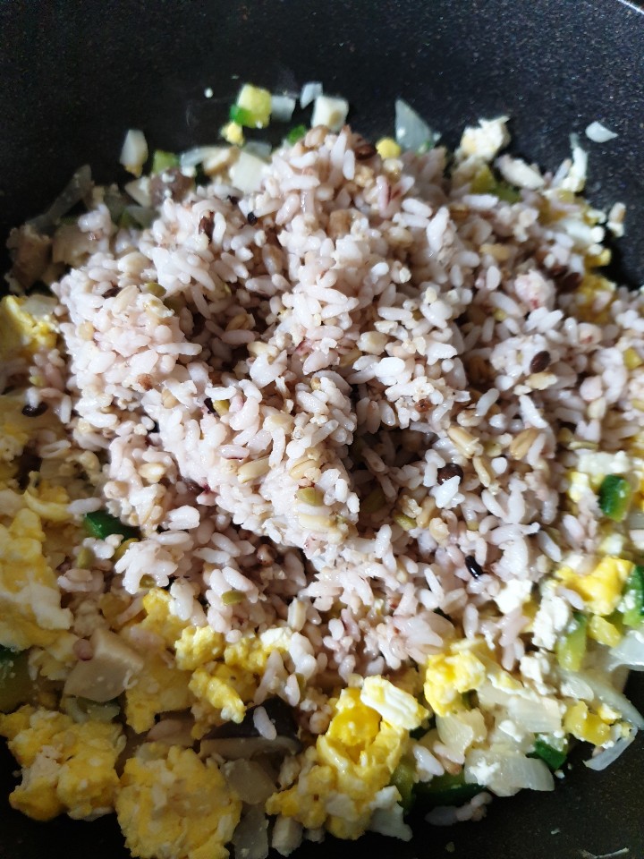 또한 수분이 있는 재료들을 볶다가 밥을 넣어주면 기름을 많이 사용하지 않고도 볶음밥을 만들 수 있습니다.
