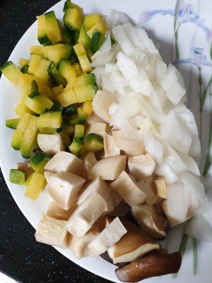 냉장고 속 야채들 (애호박, 양파, 버섯 사용)