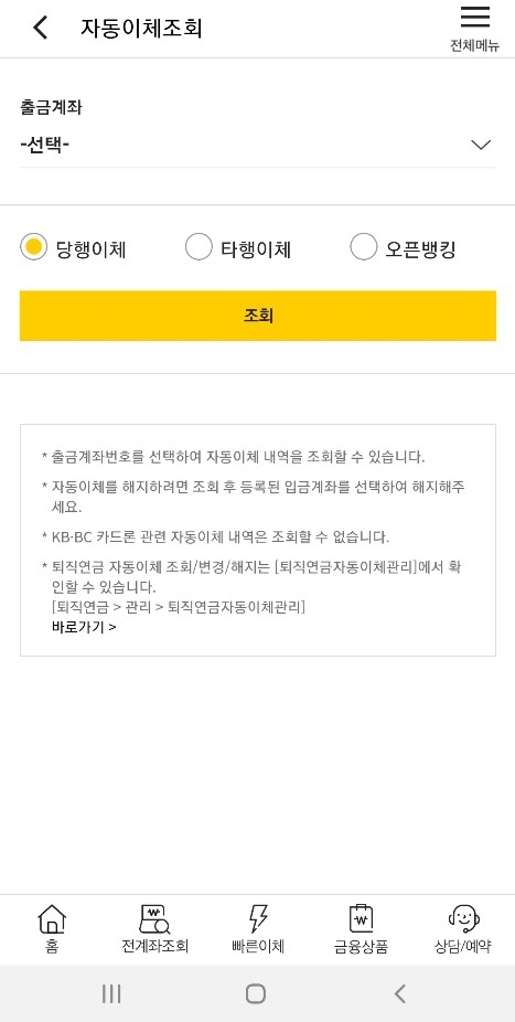 자동이체 해지를 위해서는 기존에 등록되어 있는 자동이체를 조회합니다. 만약 출금계좌가 여러 개가 있다면 해지하고자 하는 자동이체가 등록된 계좌를 선택 후 당행이체/타행이체/오픈뱅킹 중 하나를 체크한 후 조회를 눌러주세요.