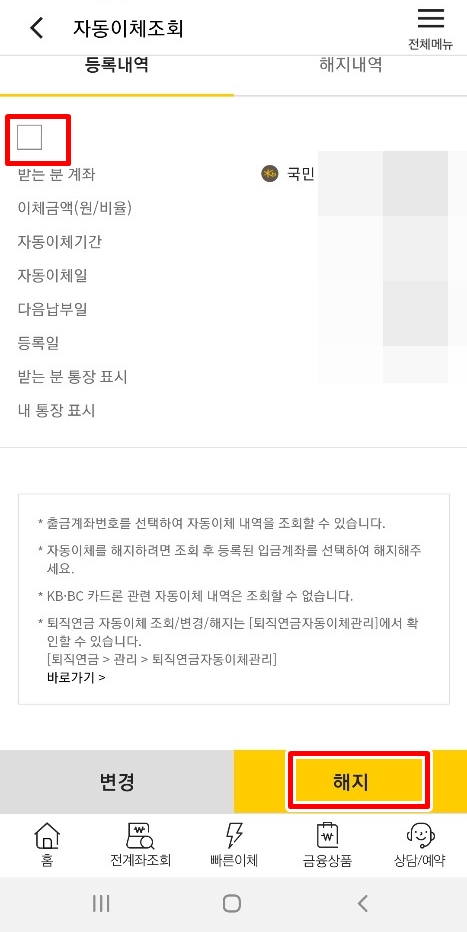 등록된 내역이 조회되면 해지하려는 자동이체 정보에 체크표시를 한 후 해지 버튼을 눌러줍니다. 이후 안내되는 절차에 따라 해지를 완료하시면 됩니다.