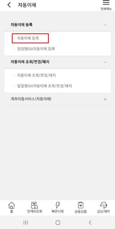 이체를 누르고 하단에 빠른이체, 예약이체, 자동이체 등을 신청할 수 있습니다. 여기서 자동이체를 선택해주세요.