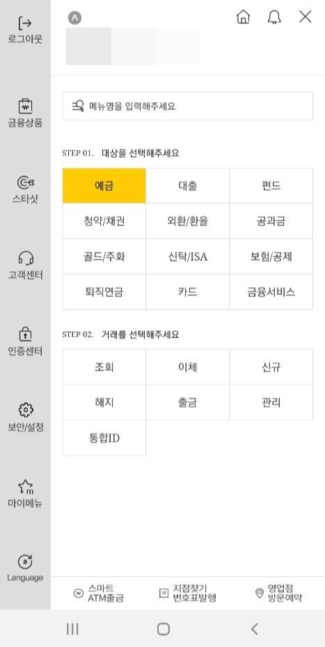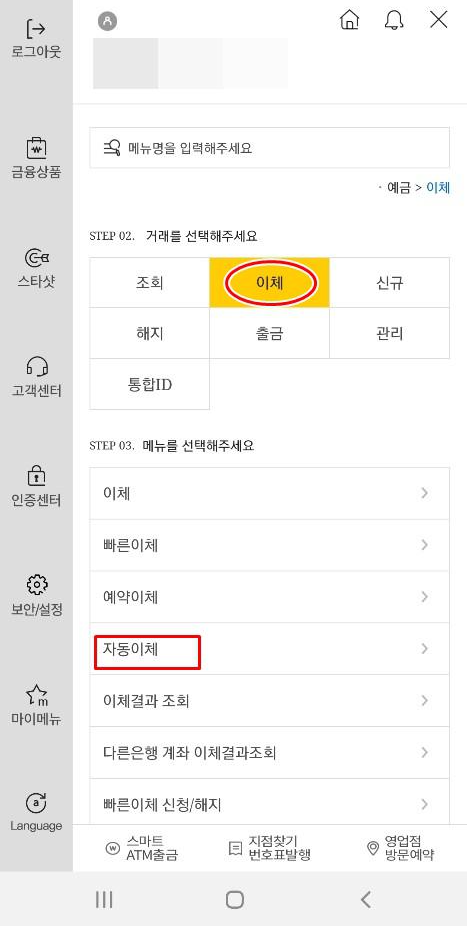 메뉴에 접속하면 다양한 카테고리가 보입니다. 자동이체 신청은 STEP 02 의 이체를 선택해 줍니다.