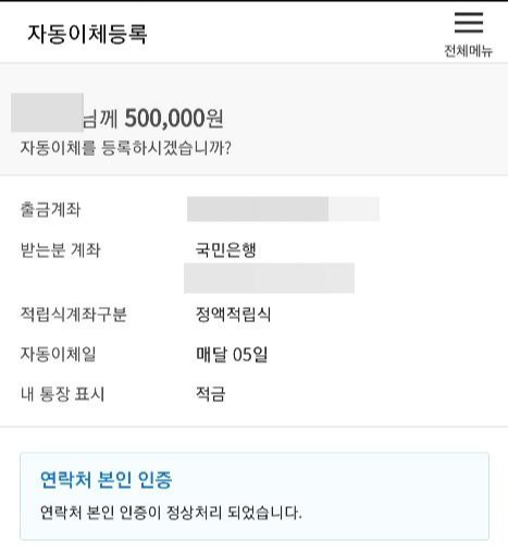 연락처 본인인증을 완료하고 자동이체 등록을 완료합니다. 등록 전 기재한 정보가 정확하게 맞는지 확인 후 마지막 등록 버튼을 꼭 눌러주셔야 신청 완료됩니다.
