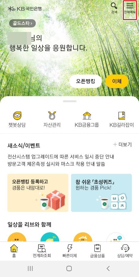 먼저 국민은행 인터넷뱅킹 어플 KB스타뱅킹에 접속해서 로그인을 합니다. 로그인 한 후 메인화면에서 오른쪽 상단의 빨간색 표시가 된 부분 (메뉴)를 선택해주세요.