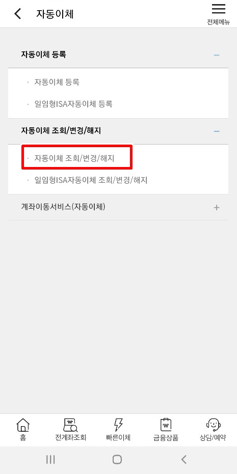 처음 자동이체를 신청한 후 정확하게 신청이 완료되었는지 조회할 때도 이 화면에서 조회가 가능합니다. 자동이체 조회/변경/해지 카테고리에서 원하는 서비스를 선택하셔서 안내되는 절차에 따라 조회 및 정보를 입력해주시면 됩니다.