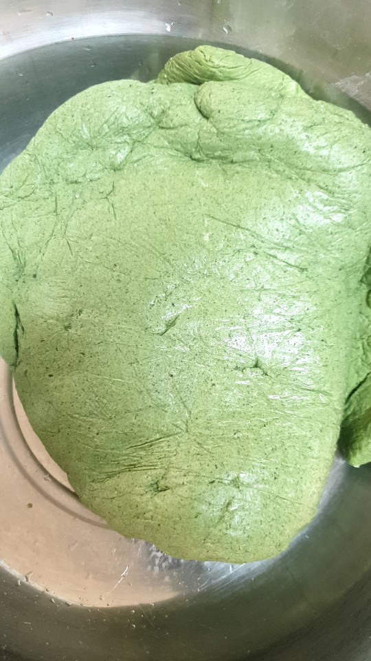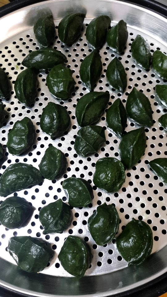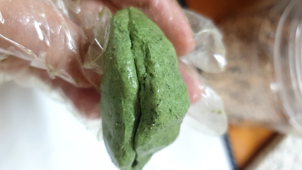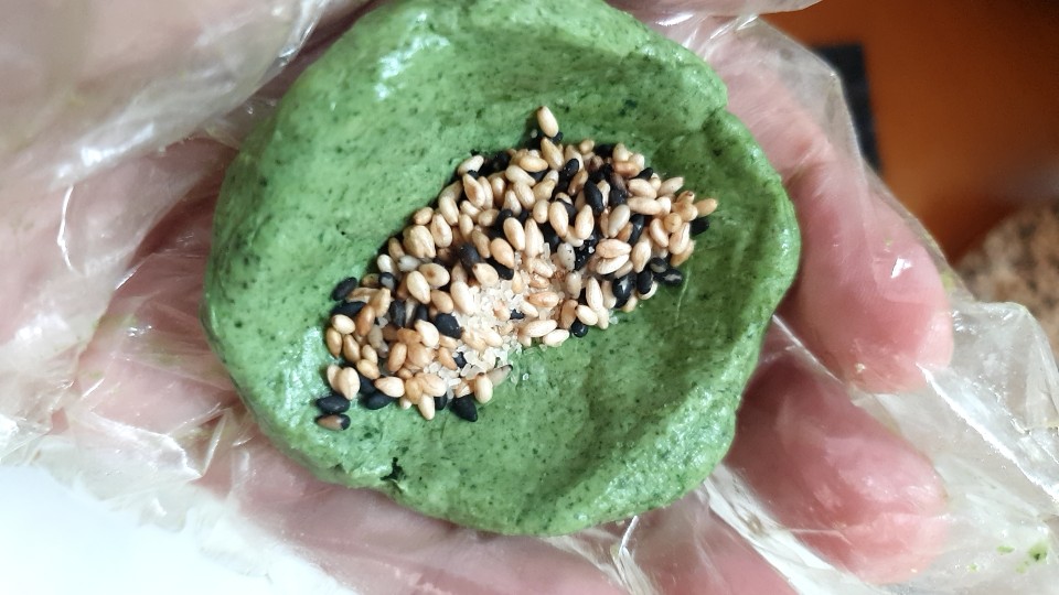모시잎을 넣은 반죽을 적당하게 떼어 동글동글하게 만들어 준 후 가운데가 움푹하게 들어가도록 모양을 잡아줍니다.