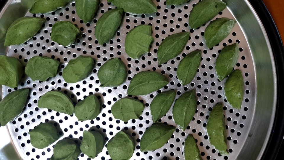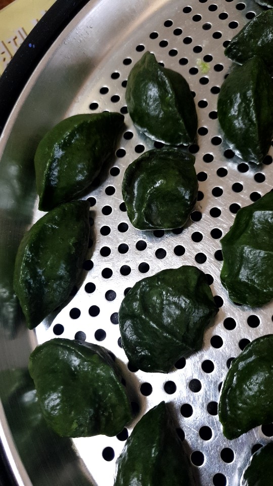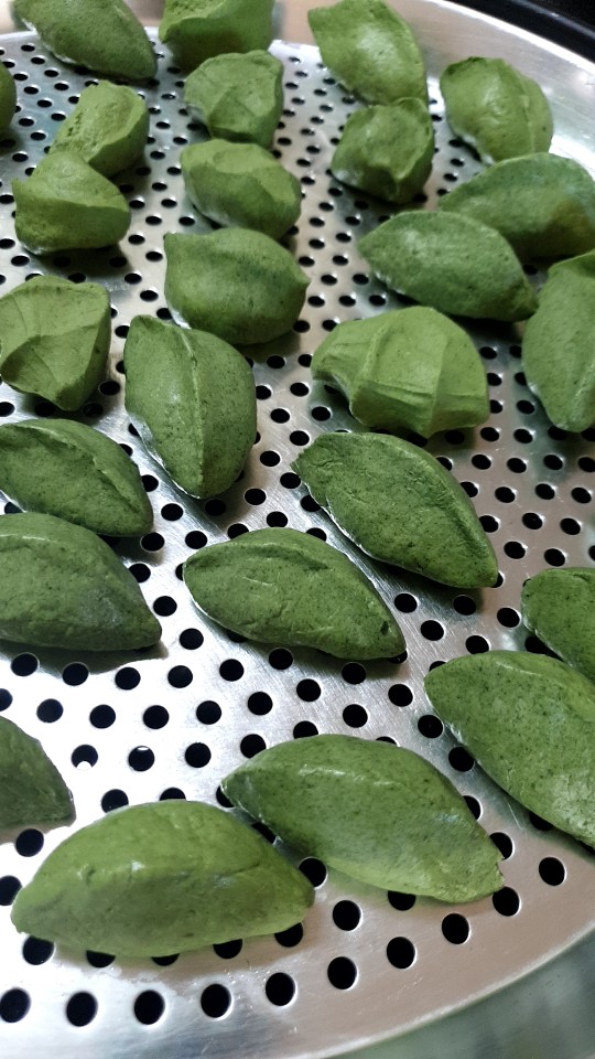 재미 삼아 다른 송편 모양을 여러 가지로 만들어서 찜기에 쪄 보았습니다. 15분 정도 쪄주면 촉촉하고 쫀득한 송편이 완성됩니다.