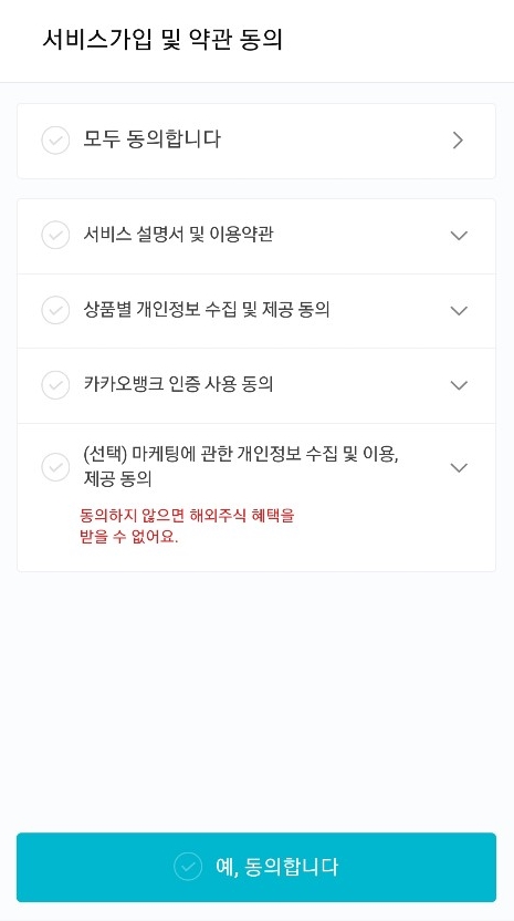 제휴 서비스에서 해외주식 투자를 눌러주면 미니스탁을 가입할 수 있도록 진행됩니다. 가입약관 등에 동의하시고 안내되는 순서에 따라 가입을 진행합니다.