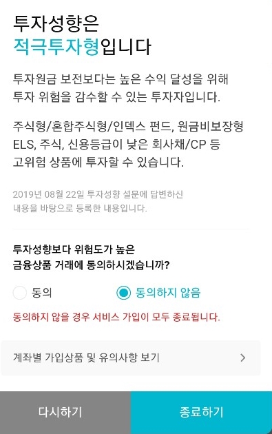 가입 진행을 할 때 투자성향을 확인할 수 있습니다. 저는 적극투자형이 나왔네요. 제 성향은 어느 정도 안전을 추구한다고 생각했는데 아마 가입 당시 설문에 응할때에는 적극적인 투자성향이 나온 것 같습니다.