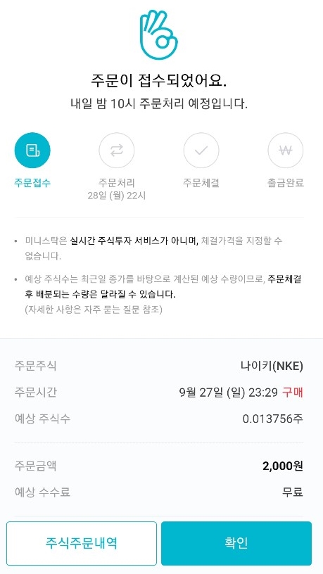 혜택으로 제공받은 나이키 주식을 테스트 삼아 주문을 넣어보았습니다. 2000원에 해당하는 주식이기 때문에 구매 가능한 예상 주식수는 0.013756주 이네요 ㅎㅎ 예상 주식수의 경우 최근일 종가를 바탕으로 계산되는 예상수량이라고 하네요.