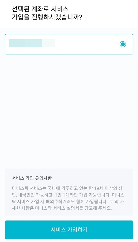 서비스 가입 및 약관에 동의하고 진행하면 한국투자증권 계좌와 연동이 가능합니다.