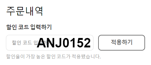구매금액이나 기간에 상관없이 상시 할인받을 수 있는 추천 코드입니다. 할인 코드 입력란에 ANJ0512를 입력하시면 5%의 추가할인이 자동적용됩니다.