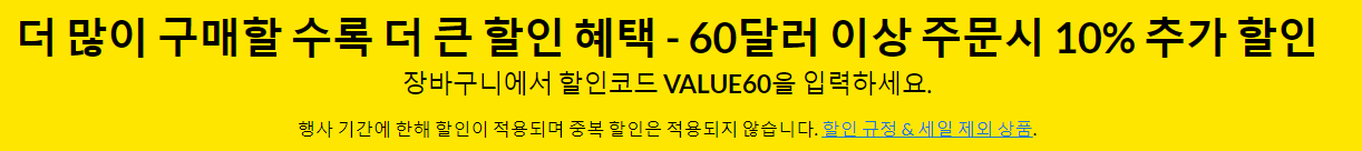해당 할인 코드는 전체 구매금액이 60달러 이상인 경우에만 사용할 수 있습니다. 장바구니 할인코드 입력란에 VALUE60을 입력해주시면 10% 추가할인이 자동적용됩니다.