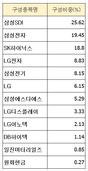 삼성 SDI, 삼성전자, SK하이닉스, LG전자 등 총 11개 종목으로 구성되어 있으며 원화 현금이 포함되어 있습니다.