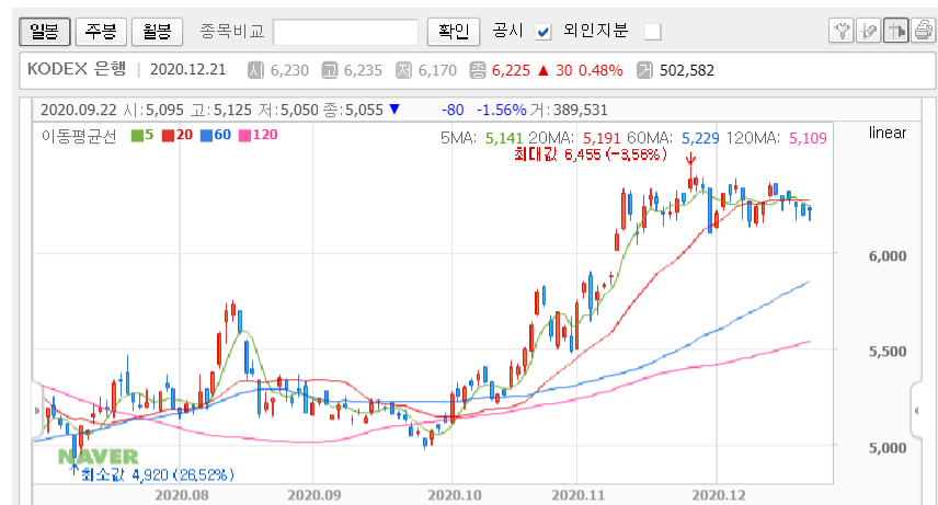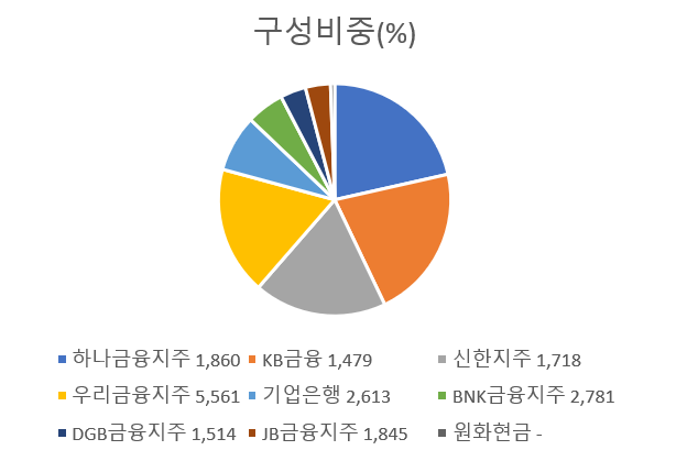 개인적으로 KODEX 은행 ETF는 소액 투자자들이 투자하기 좋은 ETF라는 생각이 듭니다. 1주에 만원이 채 되지 않는 금액 (12월 21일 기준 6225원)으로 우리나라를 대표하는 은행주들에 골고루 분산투자할 수 있는 좋은 기회라는 생각이 듭니다.