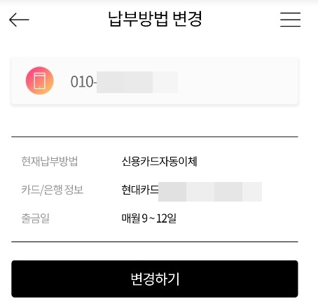 납부방법 변경 페이지로 전환되면서 변경하고자 하는 회선 번호와 납부방법, 카드/은행 정보, 출금일 등을 확인할 수 있습니다. 해당 정보가 맞다면 하단의 변경하기를 선택해줍니다.